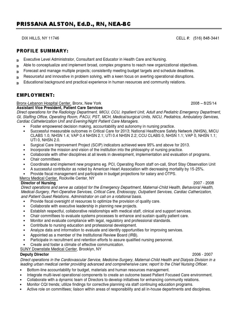 Chief Nursing Officer In Usa Resume Prissana Alston Pdf Nursing Hospital